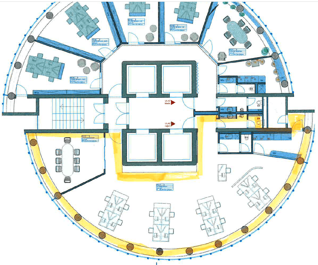 Sastoji se od open space prostora sa mogućnošću pregradnje, sobe za sastanke, kuhinje i dva sanitarna čvora.